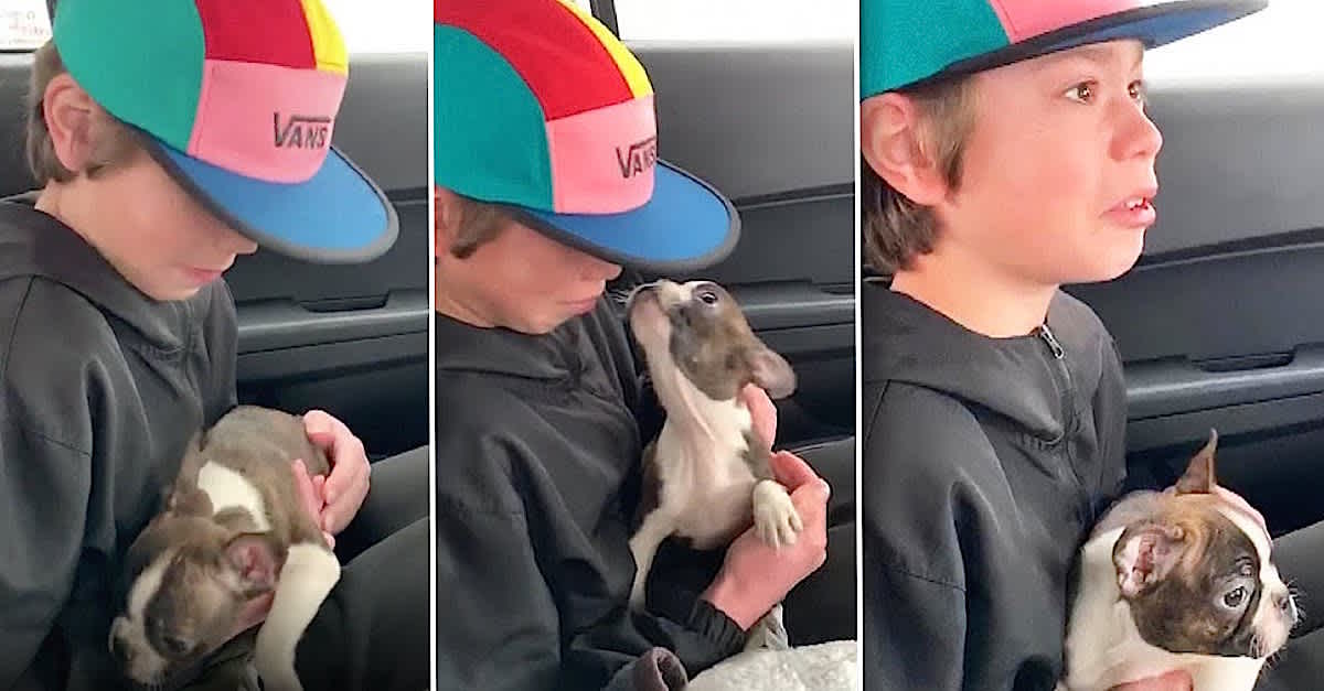 In the clip below, Logan's cousin Jon turns around in their car and hands the boy an adorable Boston terrier puppy.