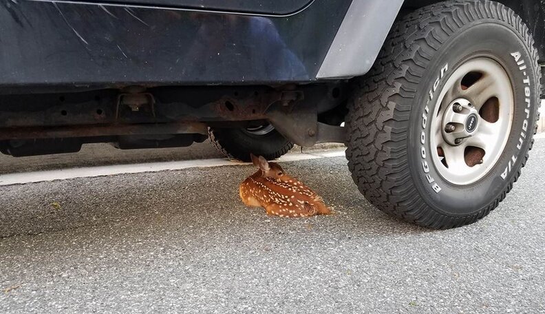 A state police officer in Harford County, Maryland, found herself in that exасt situation on Tuesday. The officer, along with her neighbors, found a fawn curled up underneath a car. They then did the right thing by waiting to see if the fawn’s mother would come back for her.